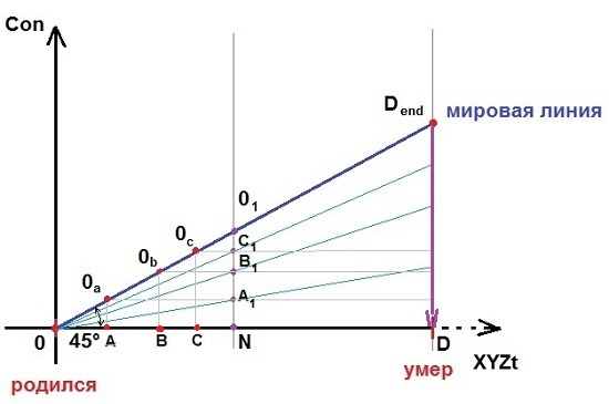 Вообще, перпендикуляр DendD - точная копия моей жизни и равен ей по длине. Ненаглядно, так как угол Мировой Линии я неудачно нарисовал. |DendD=OD|. И в любой момент времени, перпендикуляр, опущенный с Мировой Линии на OD, будет являться всей моей жизнью с момента рождения до точки его пересечения с осью XYZt. То есть, в момент XYZt происходят абсолютно все события моей истории, но вдоль оси Con.