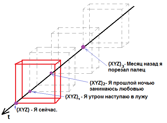 Так как мое сознание пятимерно, то я отлично могу представить себе это, что в этот самый момент времени N, по оси абсцисс прямо сейчас меня тошнит в точке с ординатой NC1, или прямо вот сейчас вдоль оси Con мне жмут руку и впаривают аттестат - NB1, и, опять же, вот именно в данный момент, в точке с ординатой NA1 меня лупят любящие одноклассники.